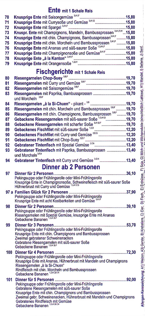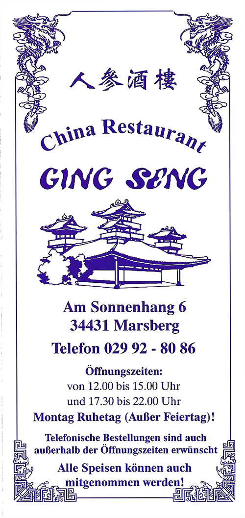 Ging Seng Öffnungszeiten Dienstag – Sonntagvon 12.00 bis 15.00 Uhrund 17.30 bis 22.00 UhrMontag Ruhetag (außer an Feiertagen)